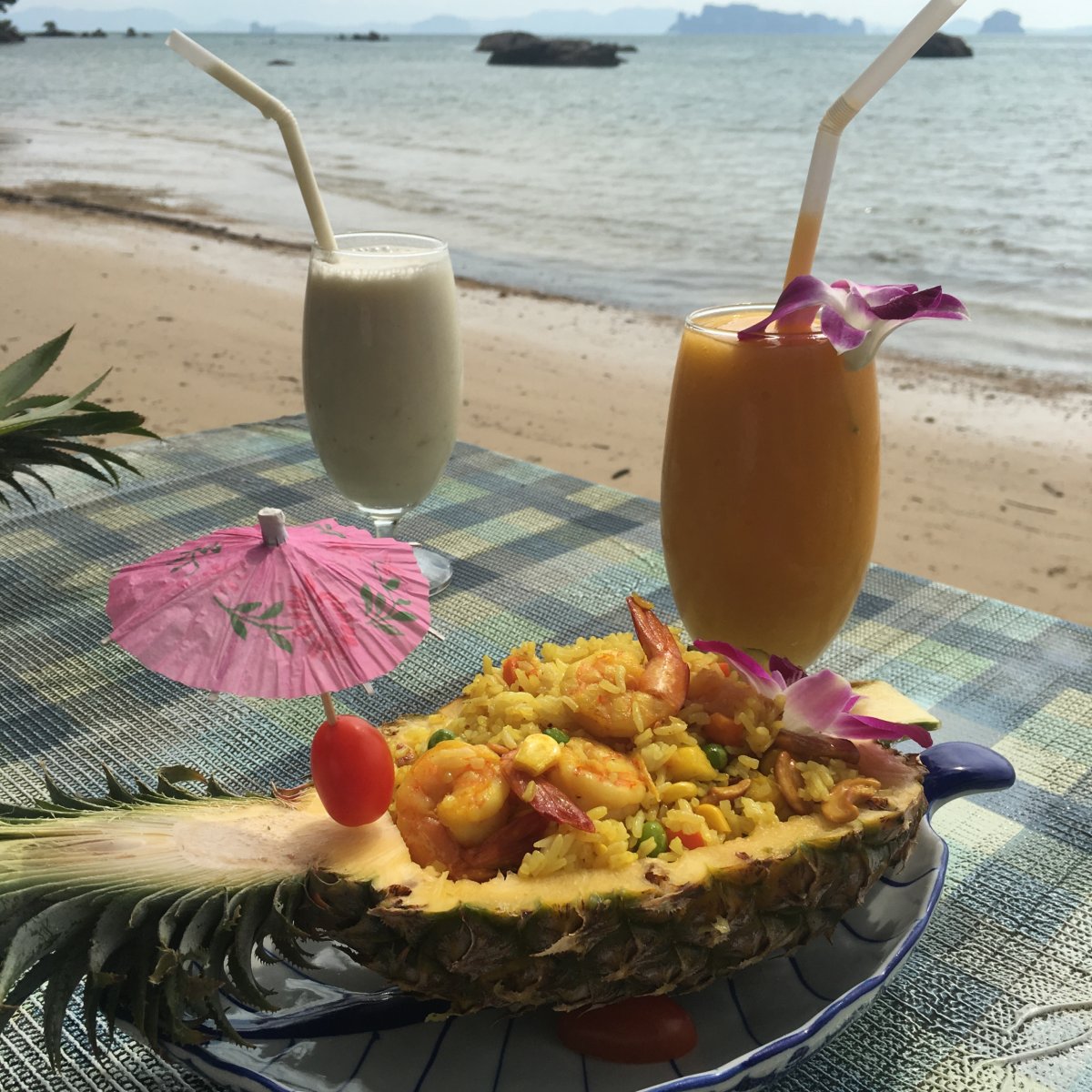 Gegessen haben wir hier immer in einer kleinen Hütte am Strand. Das Essen war zwar etwas teurer als in Bangkok, aber immer sehr lecker und hübsch angerichtet. Probiert unbedingt mal den „Fried Pinapple Rice“ und „Mango Sticky Rice“ mit süßer Kokosmilch!